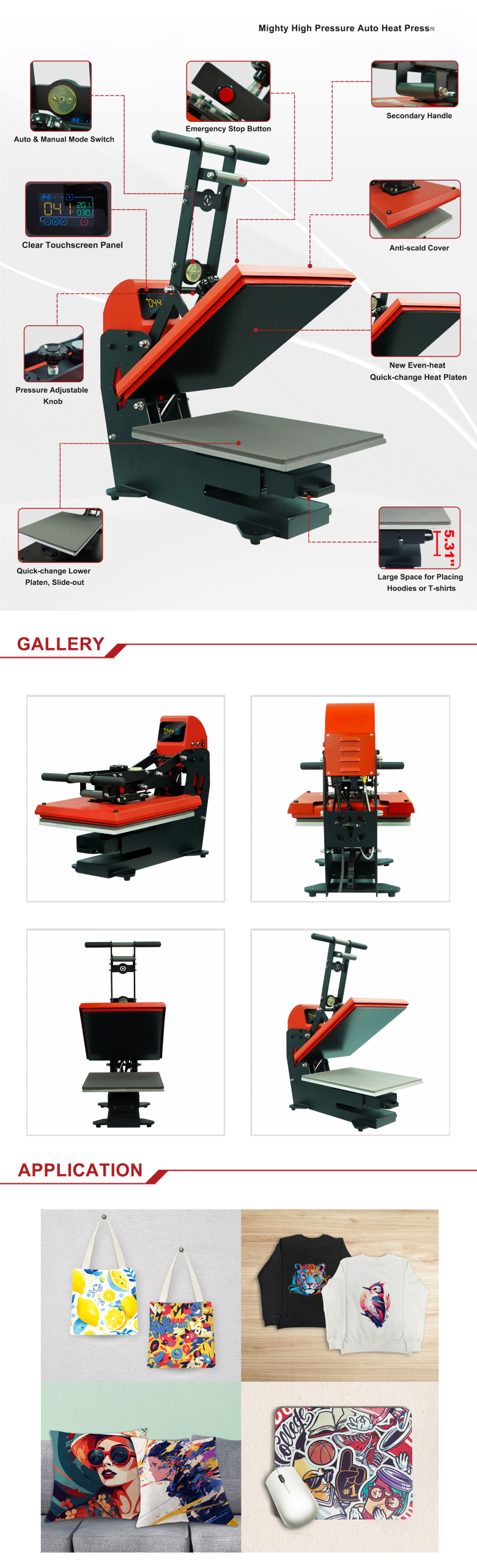 Ranging from T-shirts to Mouse Pads, anything with a flat surface is compatible with this heat-press. The revolutionary design allows for quick and easy change of the removable plates with a simple sliding mechanism.